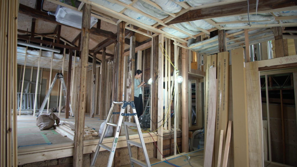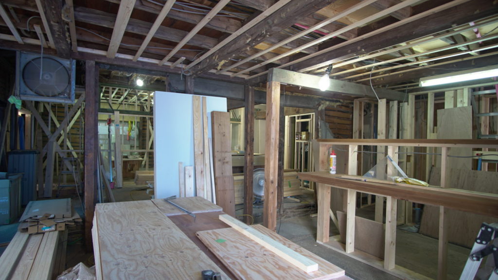 何もなかった空間に、新しい壁や天井を作るための間柱や、キッチンカウンターの骨組みが組まれています。