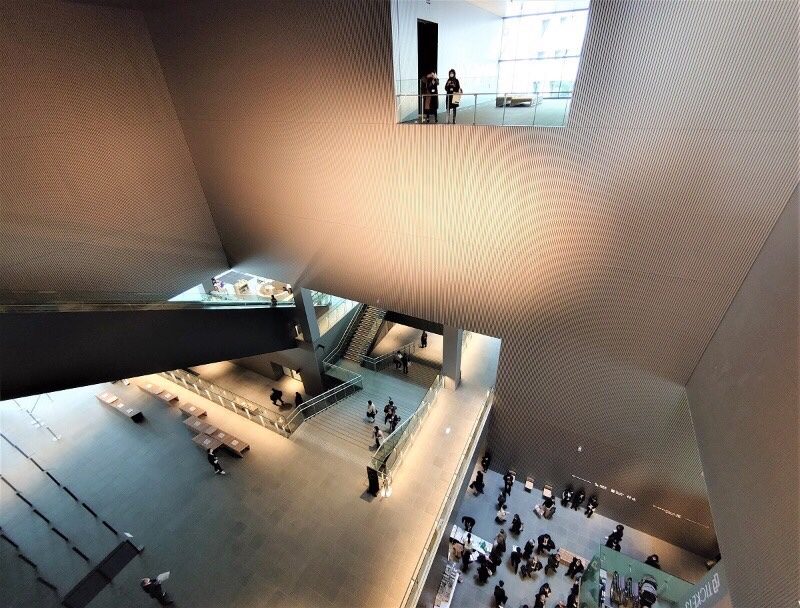 館内の複雑な空間構成、交差するエレベーターは近未来的で どこか違う空間に行ってしまいそうな感覚に。