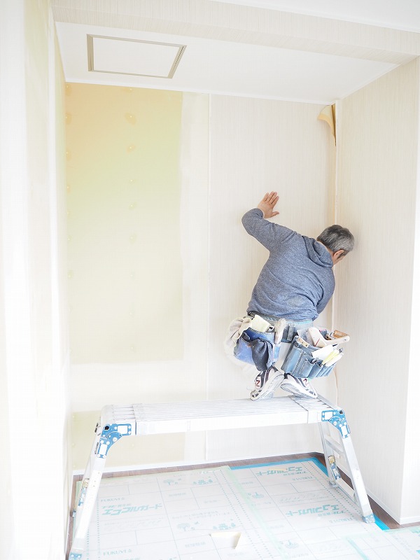 コラベル柄のクロスを使用し、収納スペースのアクセントと