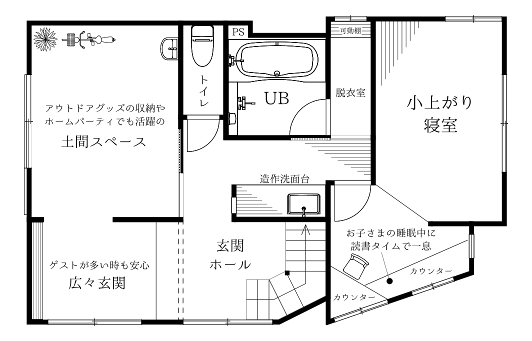 ホームパーティ以外でも、プロジェクターを投影して映画を観たり、アウトドアグッズのお手入れをしたりと様々なシーンで活躍する土間は必見です。
