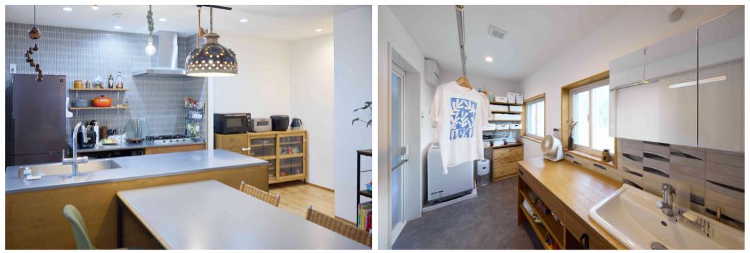 また洗面台も造作で。作業スペースを設けた洗面台は洗濯物を畳んだり、アイロンを掛けたりと家事もスムーズです。