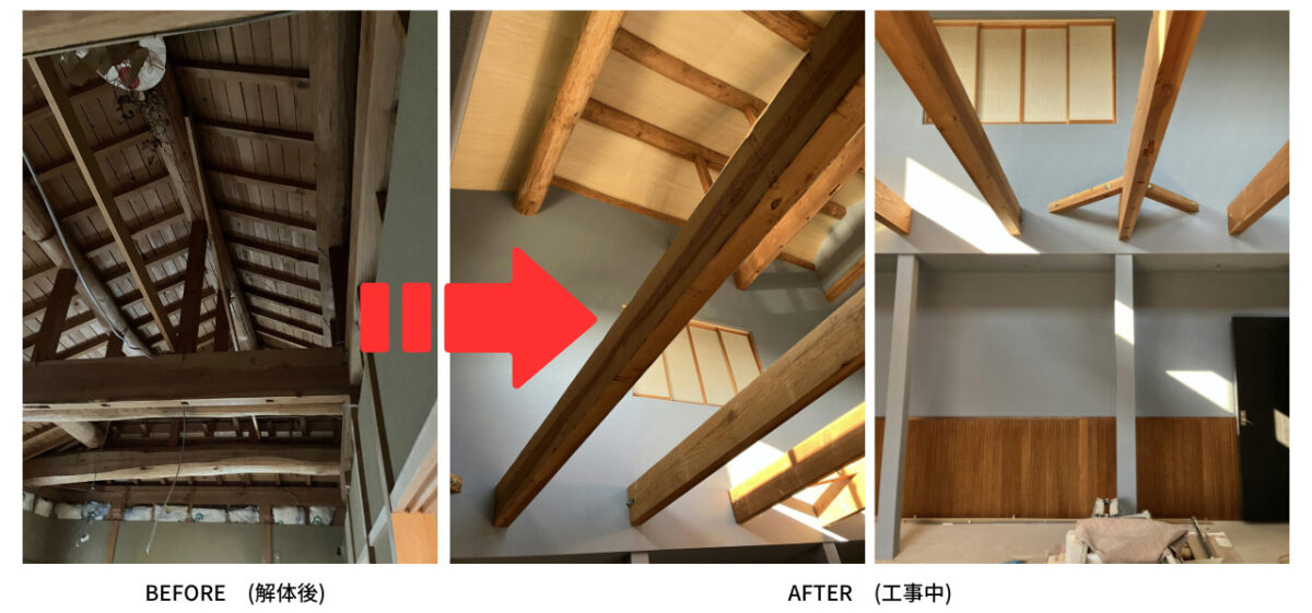 使われなくなっていた和室二間をつなげ、さらに2階の和室を解体し、吹き抜け天井へ。
