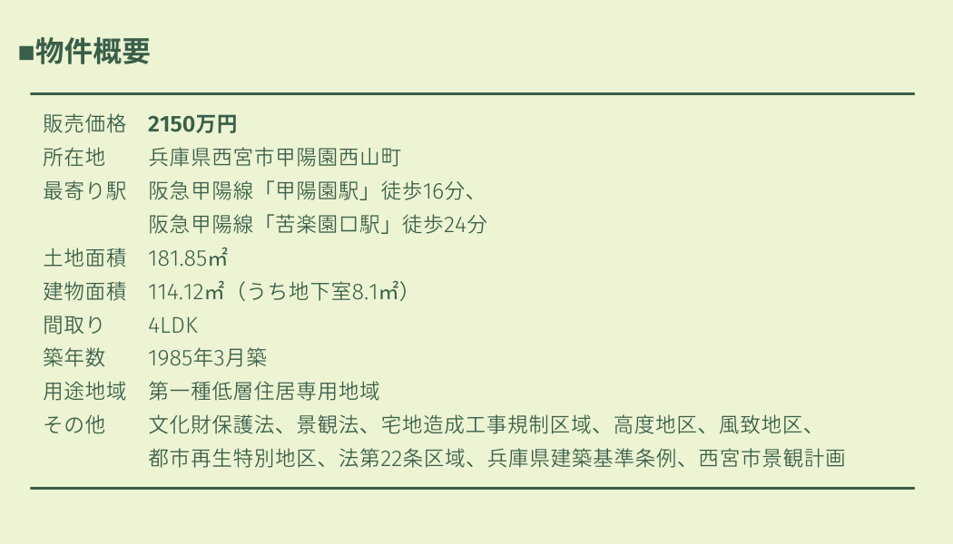 今回、見学・販売会を開催する物件は、西宮市甲陽園西山町、高台に位置する1985年築の木造2階建て(地下1階付き)、開放的な眺望が魅力の4LDK、甲陽園エリアでは貴重な「リノベーション前」物件です。
