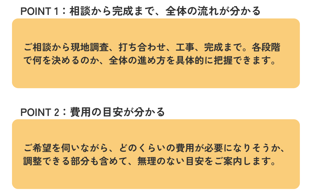 建築士の資格を持つ専任スタッフが、お客様それぞれの状況に合わせてお話をお伺いいたします。