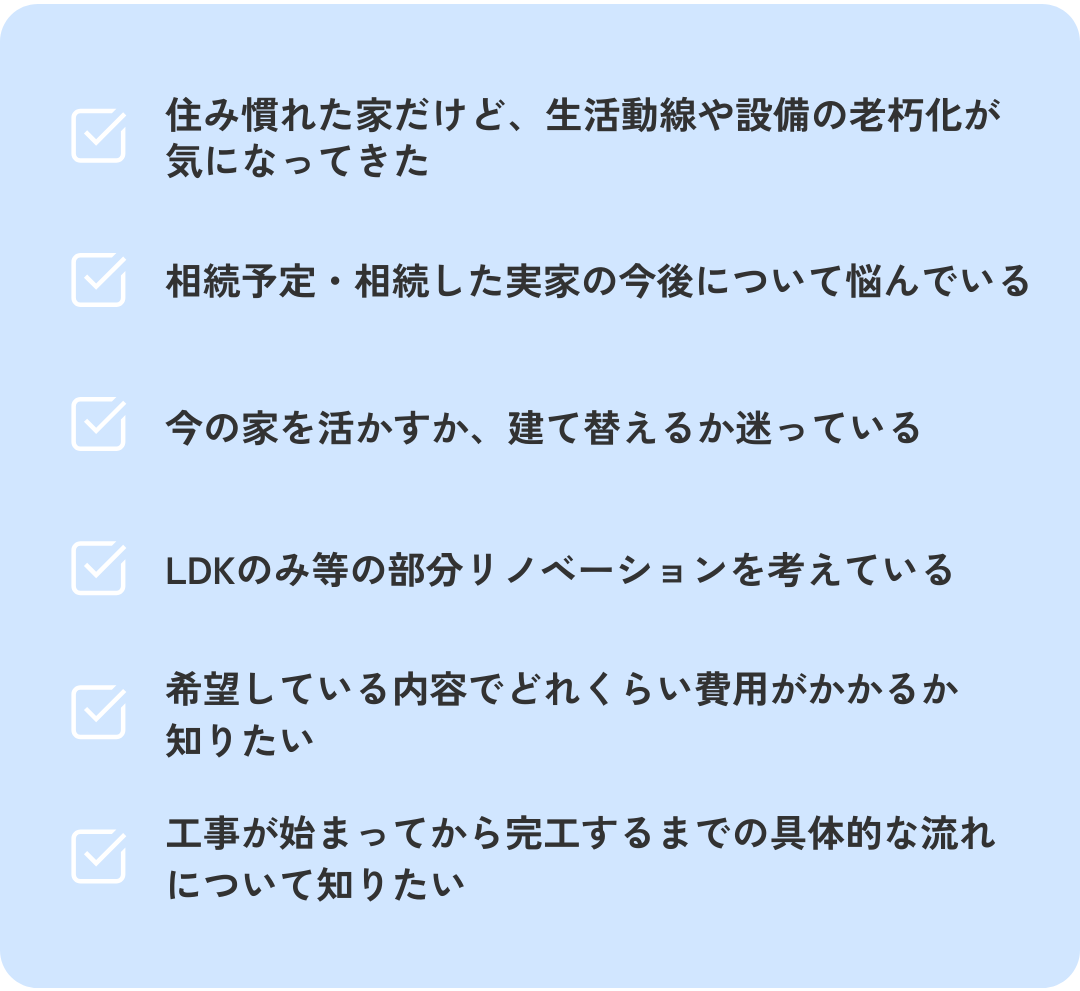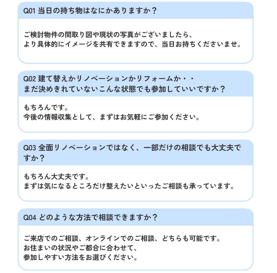 自宅や実家のリノベーションを検討しているけれど、いったい何から始めれば良いか分からないという方に向けた個別相談会です。