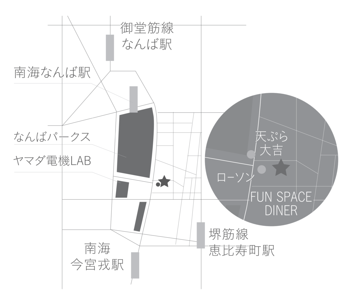 | 場所 | FUN SPACE DINER 大阪市浪速区日本橋西1-3-26 https://www.funspacediner.com/ |