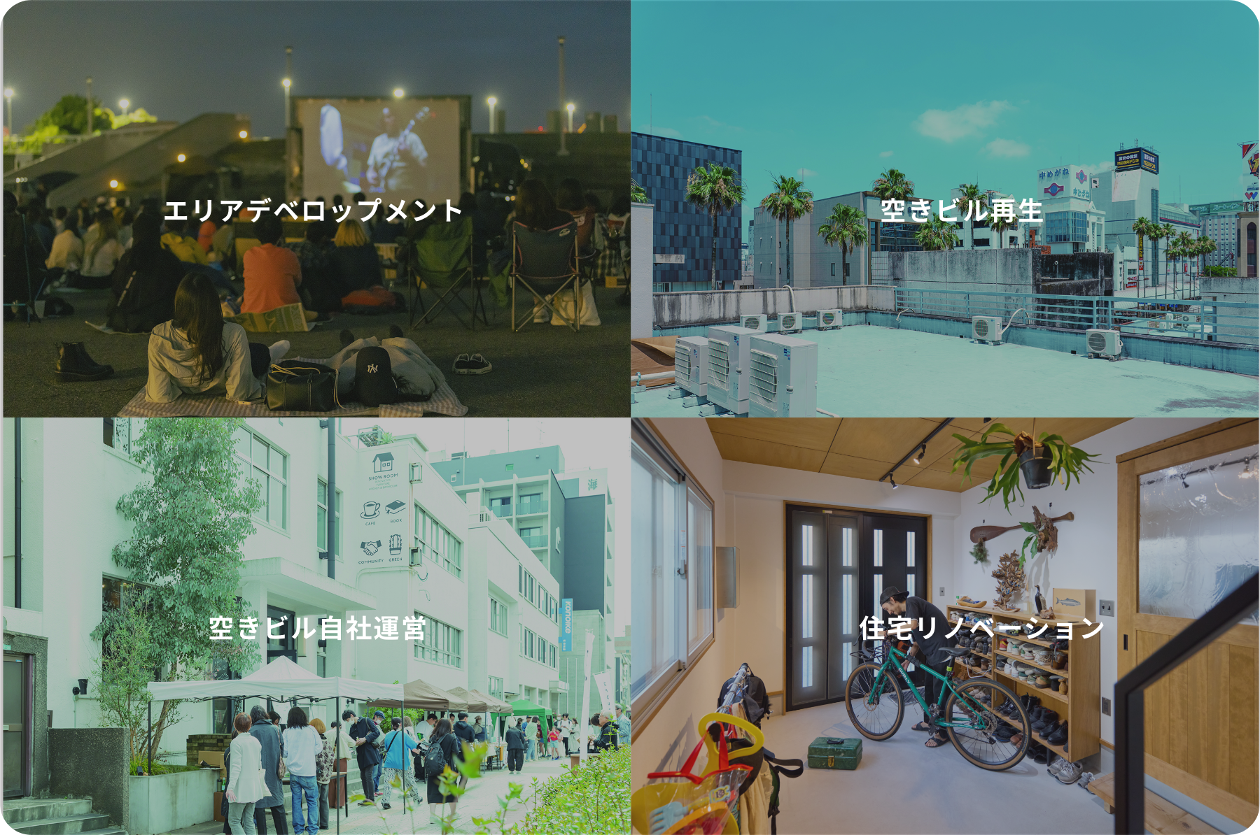 私たちは、個人の「暮らし」を豊かにする住宅リノベーションから、空きビルの活用・運営といった「事業」の創出、そして「まち」を元気にするエリアリノベーションまで、多角的なアプローチで課題解決に取り組んでいます。