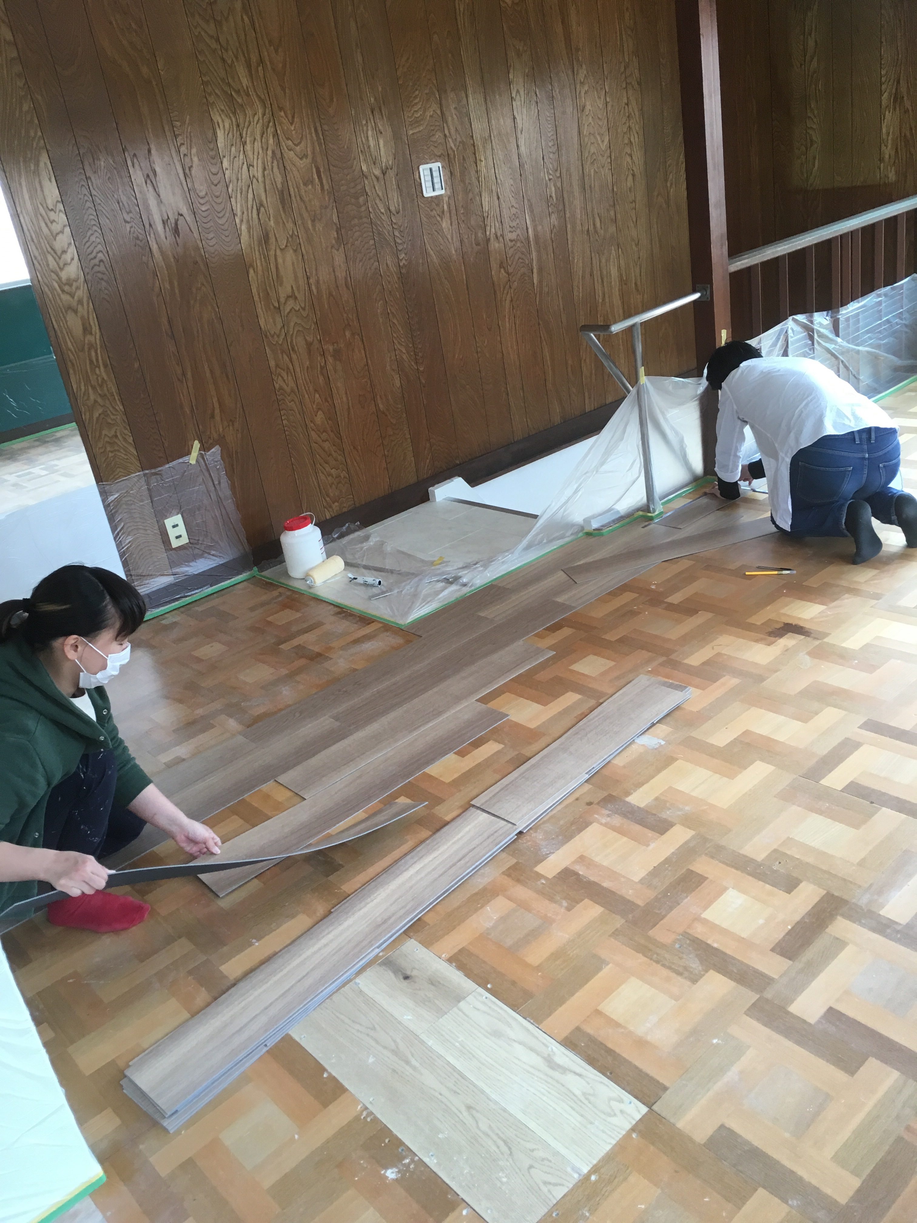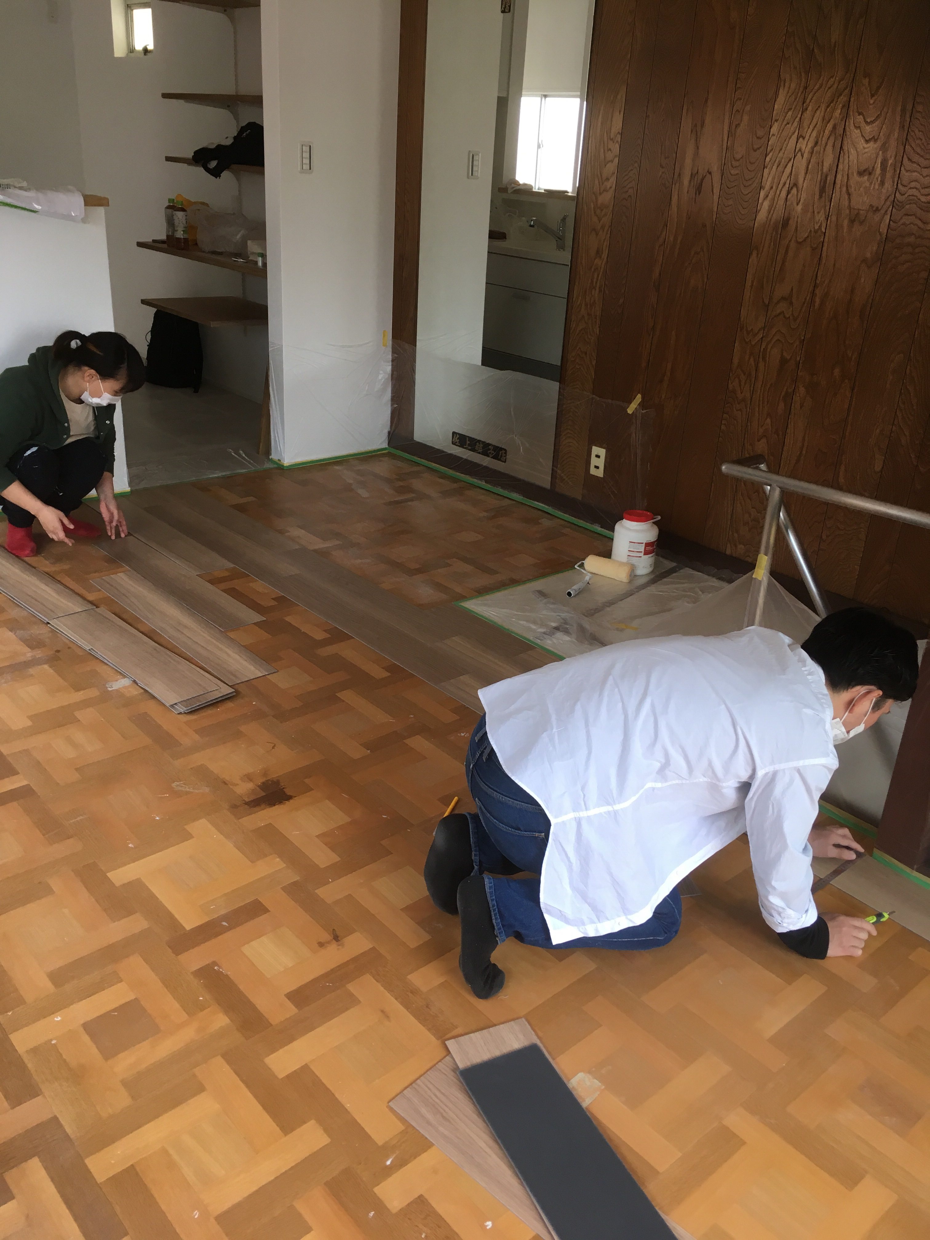 糊を乾かして透明になったら置いていくリフォームフロアです。