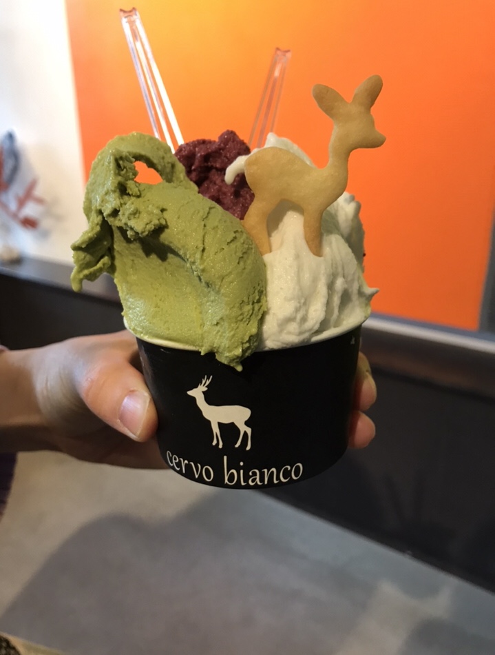 次に油物を食べた口をサッパリさせるためにイタリア料理店がやっているジェラート屋さんに。抹茶×牛乳×ブルーベリーで頂きました。かわいい鹿のクッキーも付いています♪