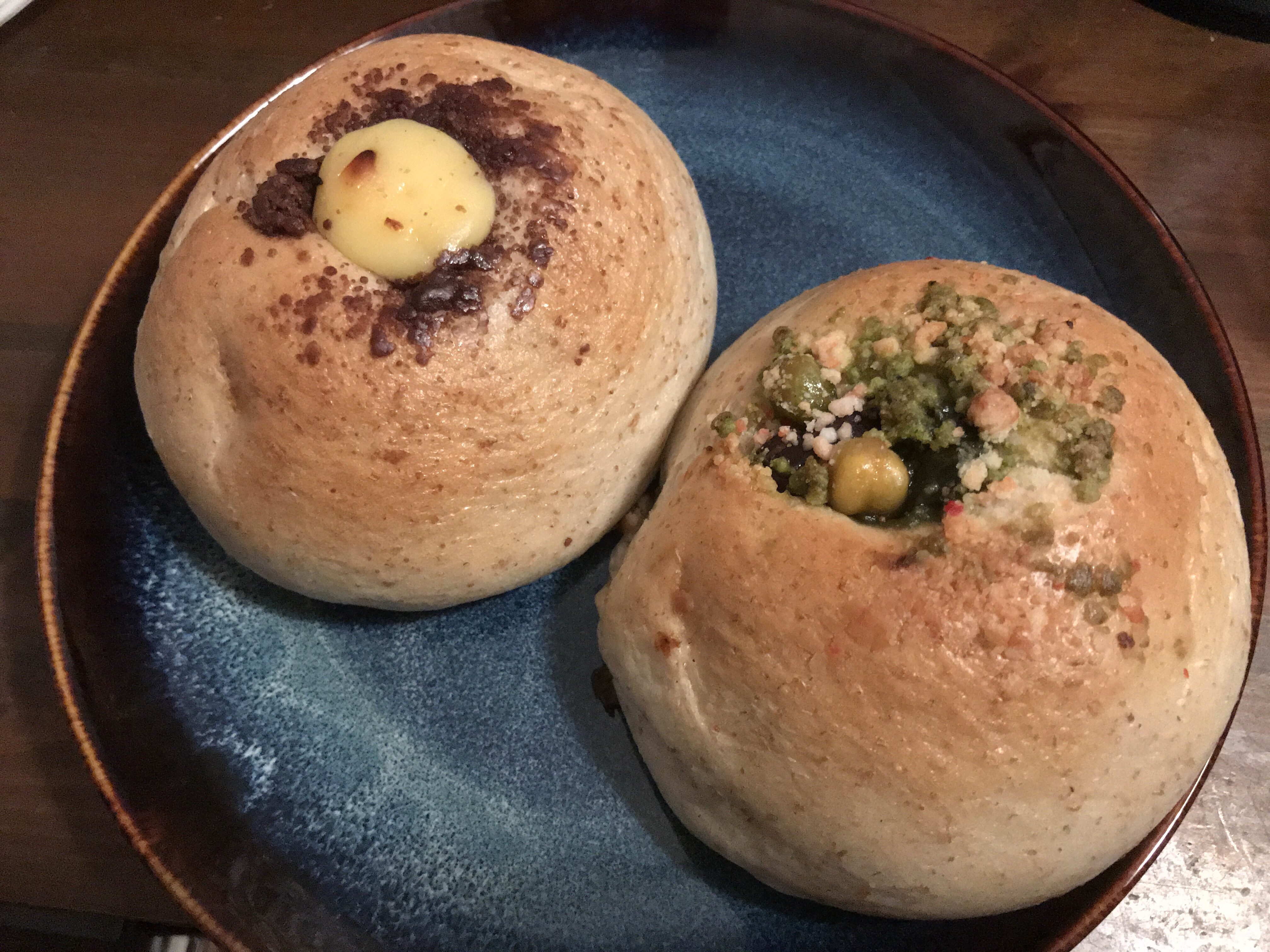 あんこカスタードクリームと、なんとか豆と抹茶カスタードのベーグル。