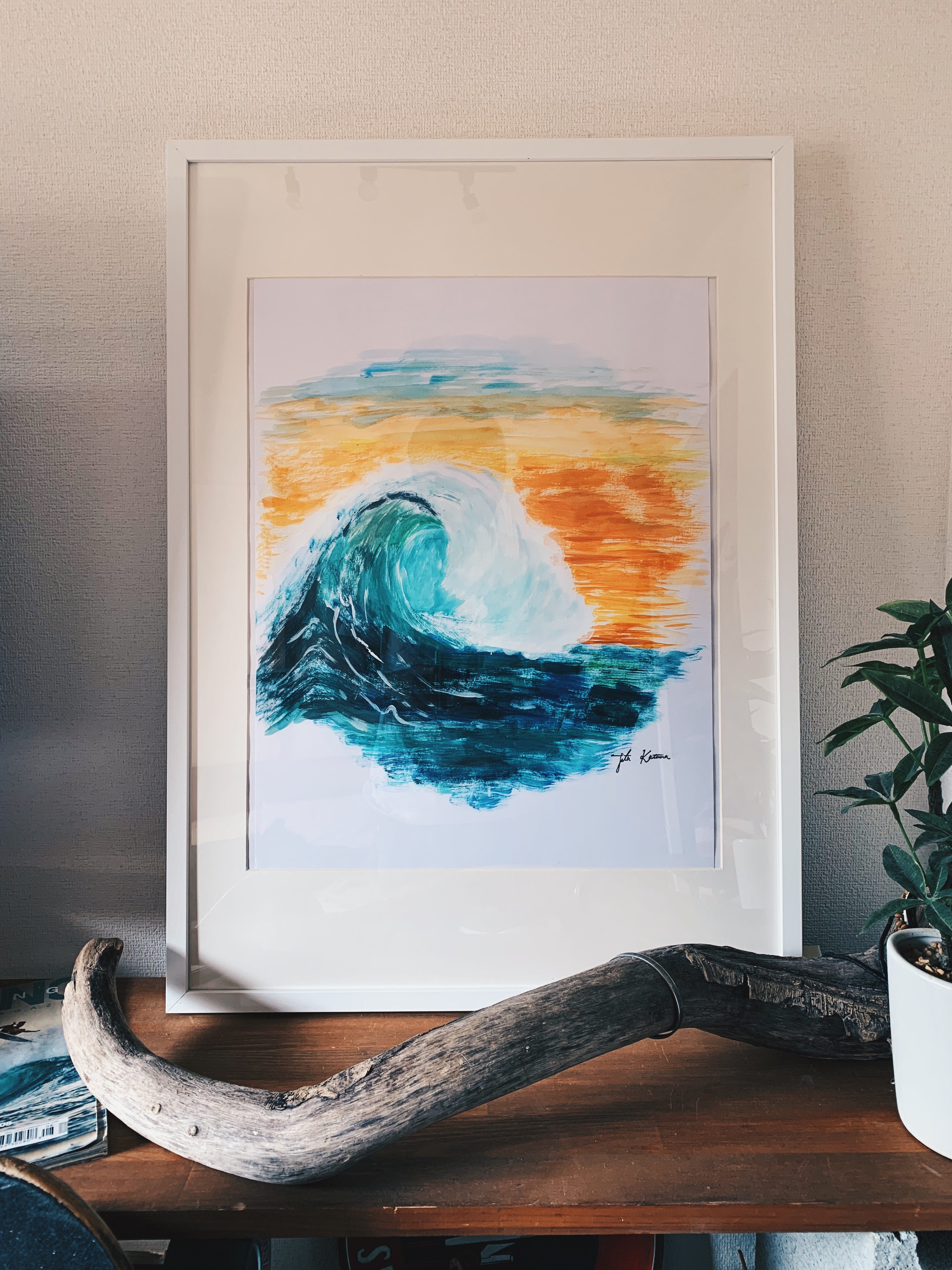 サーフィンが趣味の私はこよなく波を愛しているので、夕焼けに立ち上がる波を描いてみました。