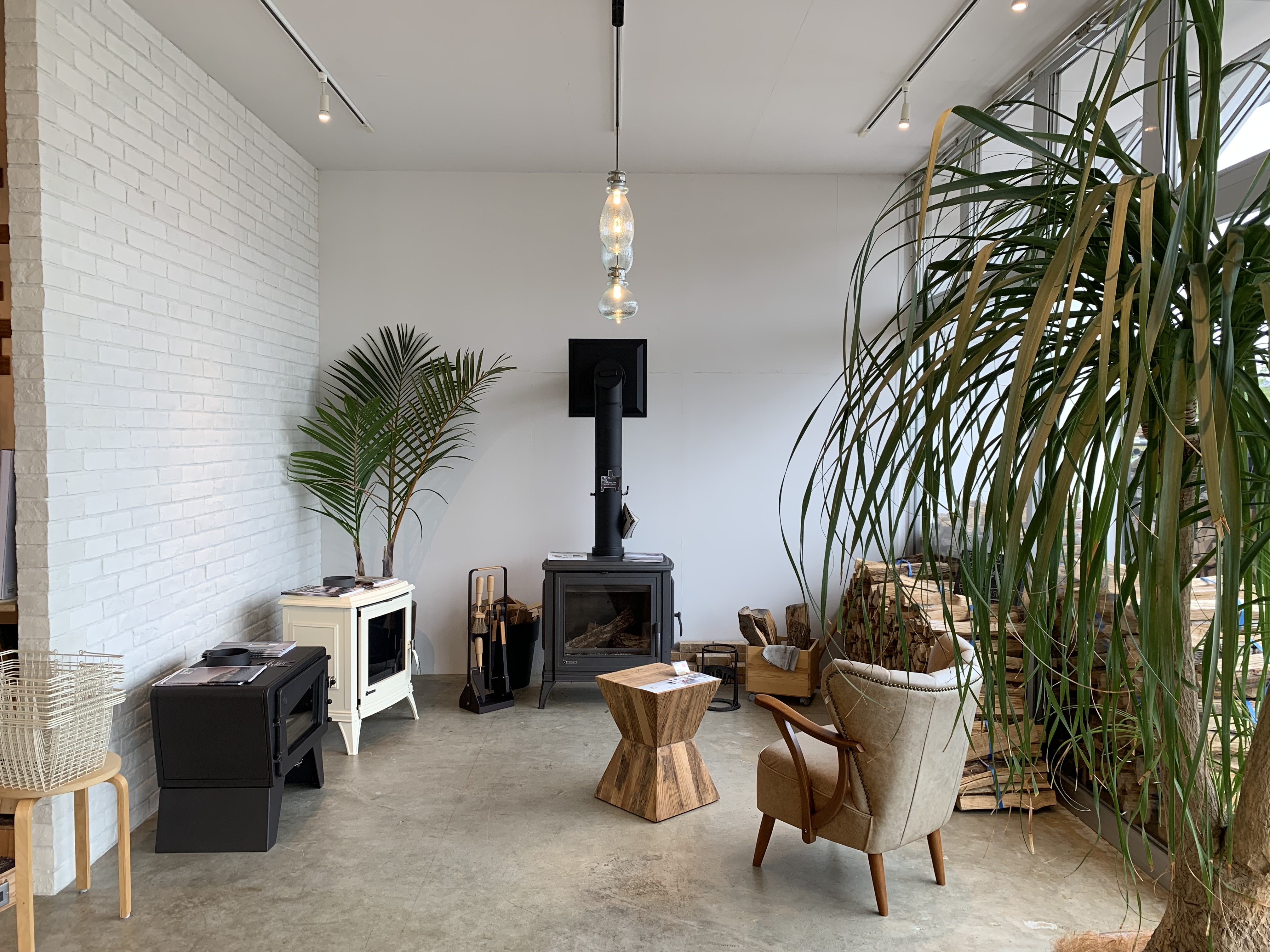 入り口すぐに薪ストーブのショールーム!