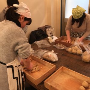 私たちは麹と塩と袋の中で潰した大豆をコネコネするだけです。