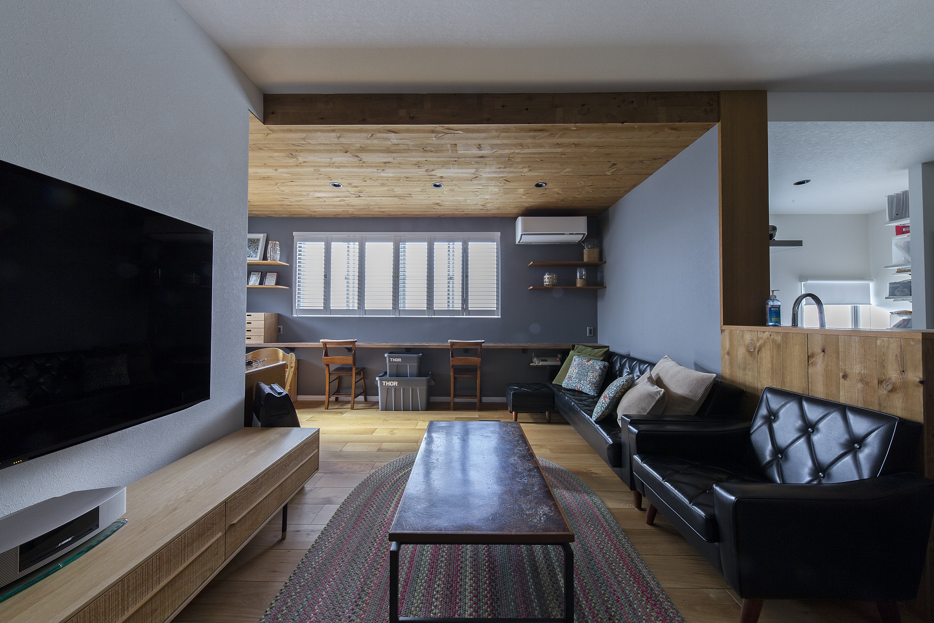リビングのカウンター上の天井、かっこいいでしょ?荒い素材感を残したかったから、クリア塗装でお願いしました。