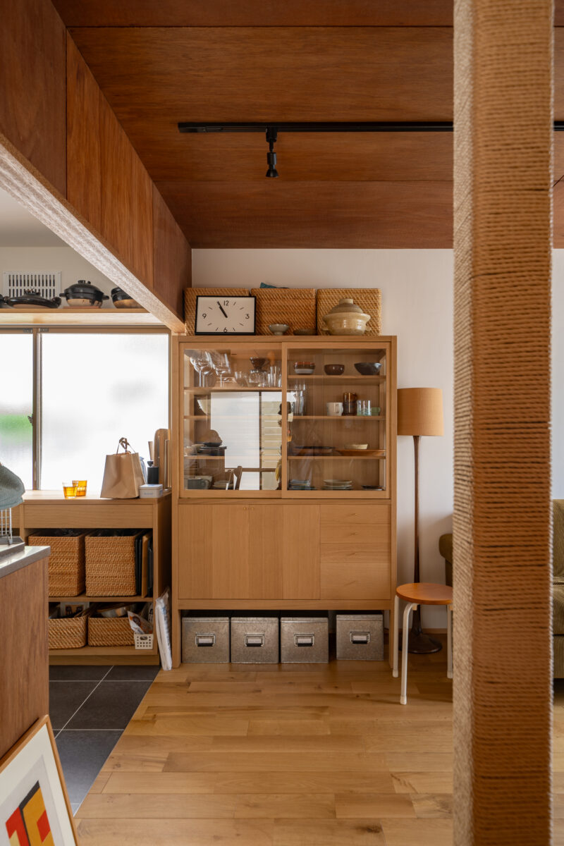 ▲北欧テイストの家具を手掛ける、大川家具製作所でオーダーメイドしたカップボードとキッチン背面収納棚。飲食系の自営業をされているご主人が選んだこだわりの器たちが、丁寧に陳列されています。