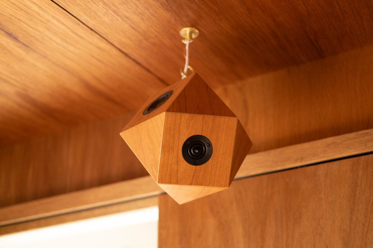 ▲お洒落な天井釣りのインテリア…?かと思いきや、実はスピーカー。「listude」という奈良のオリジナルスピーカー製作所の作品です。「Listen(聴く)」と「Attitude(姿勢・態度)」を掛け合わせた造語で、聴くことでつくられる風景を大切にしているそう。