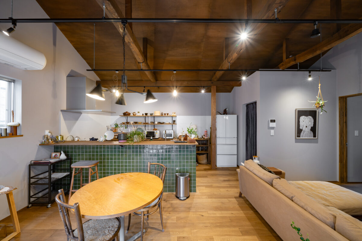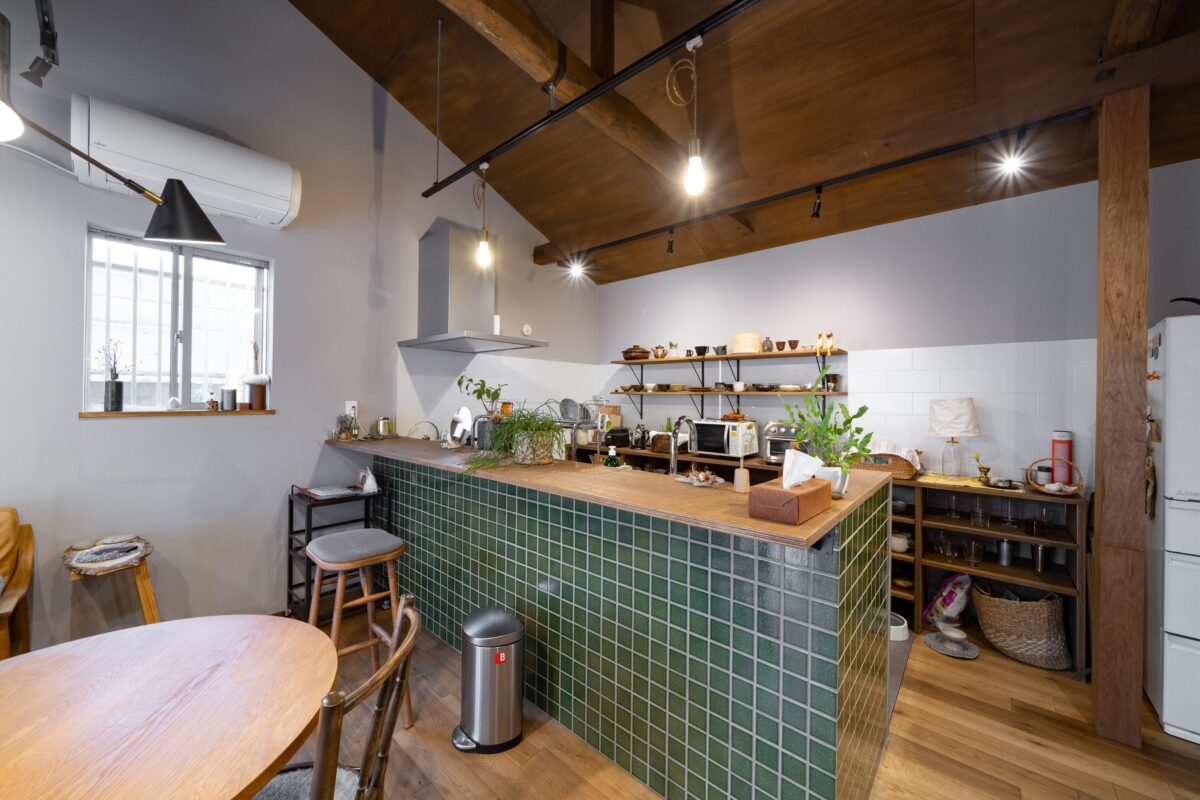 家全体がグレーの壁と木で落ち着いたカラーでまとまっていますが、アクセントになっているのがキッチンの鶯色のタイル。