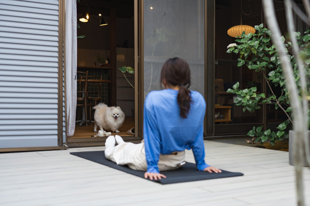 気分転換でデッキテラスでストレッチをすることも。愛犬のぽぽちゃんも見守ってくれています。