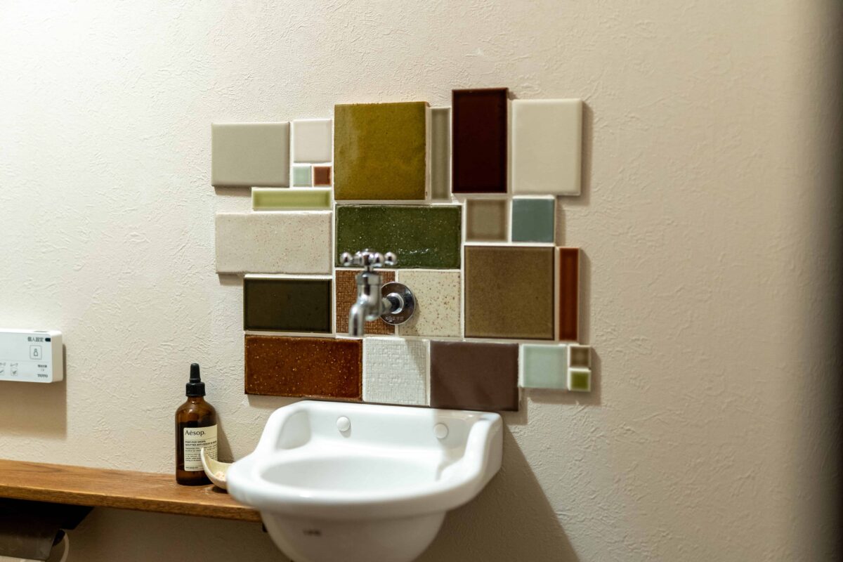 どれも気に入ったタイルだったからどうしても使いたい・・!ということで、サンプルをかき集めてお手洗いの洗面に貼ることにしました。