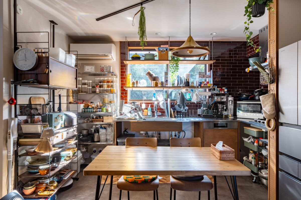 造作キッチンは、棚板や扉を付けずにシンプルに外側だけを作ったもの。お手持ちのワゴンや収納グッズで自分たち流にカスタムして使いやすくしています。